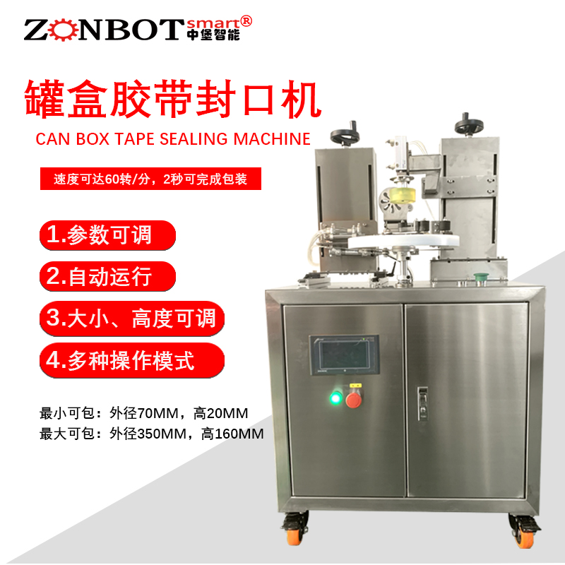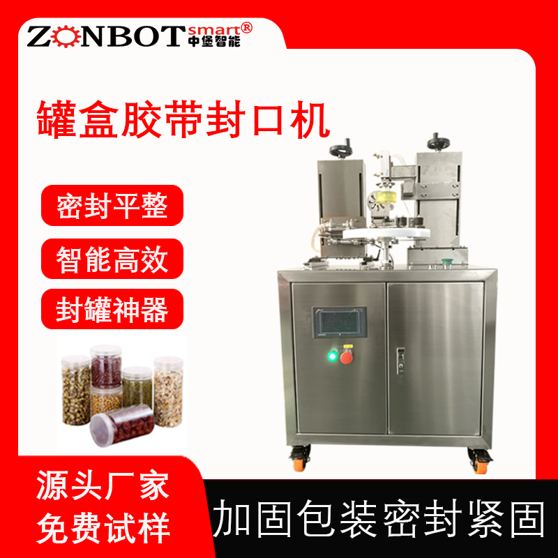 罐盒膠帶封口機是一種專門用于對罐盒等容器進行封口的設備,主要是通過膠帶粘貼的方式來密封容器開口。其工作原理是將膠帶從膠帶卷上引出,然后利用機械裝置將膠帶平整地貼合在罐盒的開口邊緣,經過滾壓等方式使膠帶牢固地粘在罐盒上,從而實現封口。 結構組成 膠帶供給系統:包括膠帶卷放置軸、膠帶張力控制裝置和膠帶引導部件。膠帶卷放置軸用于安裝膠帶卷,其設計要能適應不同尺寸的膠帶卷。膠帶張力控制裝置可以確保膠帶在輸送過程中保持適當的張力,避免膠帶過松或過緊。膠帶引導部件則負責將膠帶從膠帶卷準確地引導到封口位置。 封口執行機