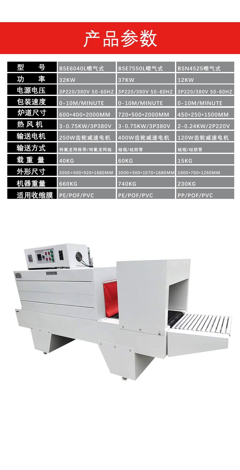 • 輸送速度:輸送速度決定了產(chǎn)品在加熱通道內(nèi)的停留時間,從而影響薄膜的收縮效果。輸送速度一般在 0.5 - 10 米 / 分鐘之間可變。對于大型、復(fù)雜形狀或需要充分收縮的產(chǎn)品,通常會采用較慢的輸送速度,以保證足夠的加熱時間;而對于小型、簡單形狀的產(chǎn)品,可以適當(dāng)提高輸送速度來提高包裝效率。