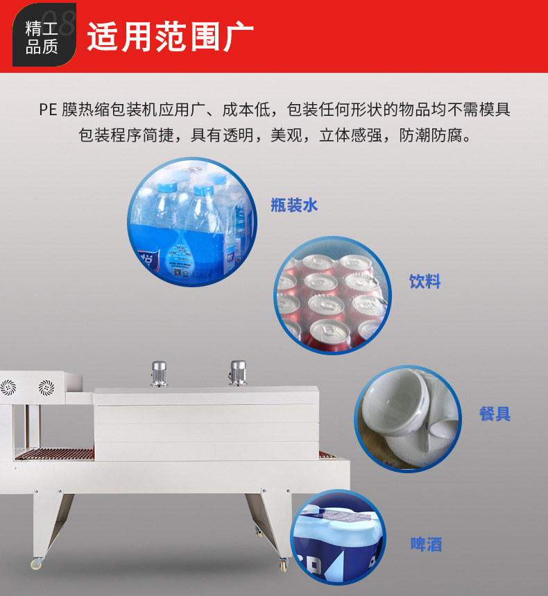 PE 薄膜本身具有良好的柔韌性,再加上 PE 熱收縮機可以通過調(diào)節(jié)輸送速度、加熱溫度等參數(shù),使得它能夠?qū)Ω鞣N形狀(如圓形、方形、不規(guī)則形狀)和尺寸的產(chǎn)品進(jìn)行包裝。例如,無論是包裝小型的文具,還是大型的工業(yè)零部件,PE 熱收縮機都能發(fā)揮作用。