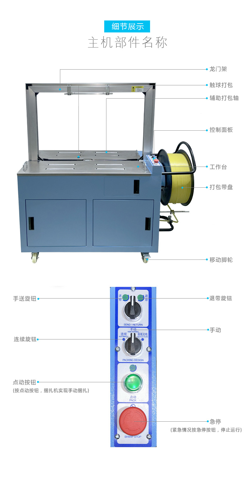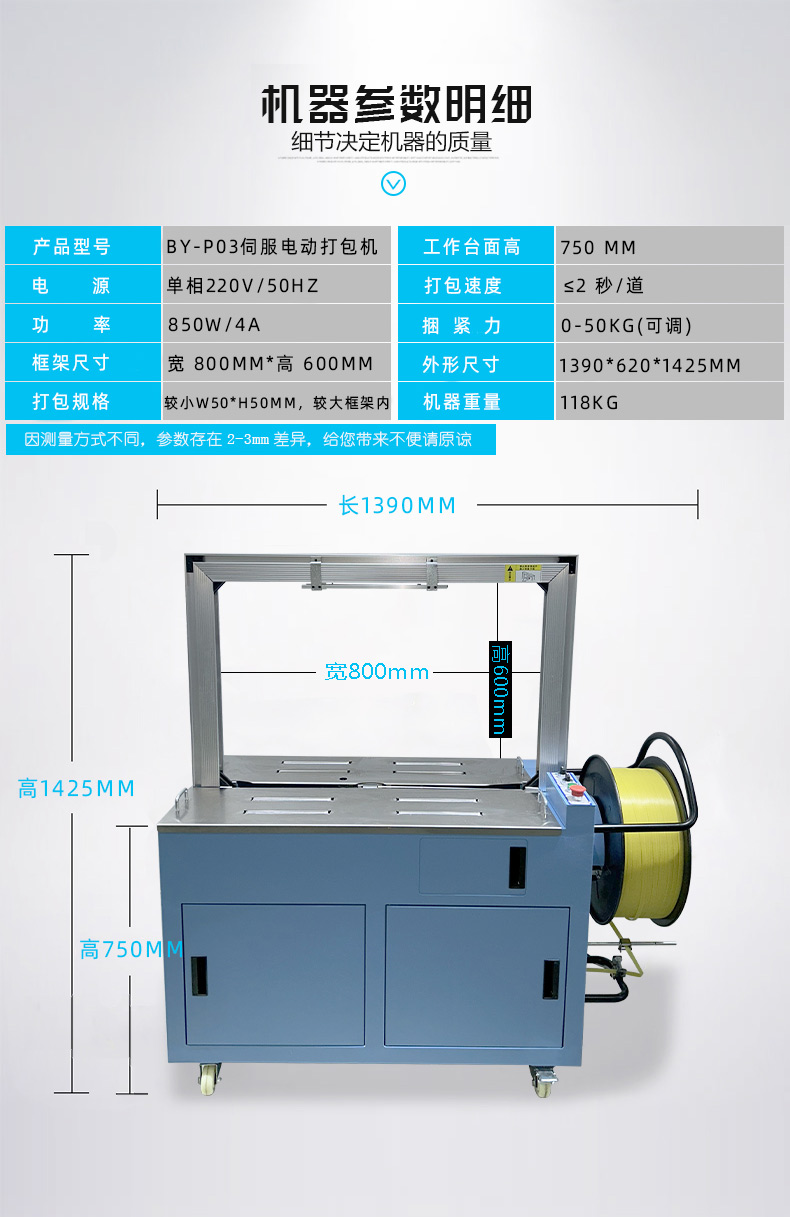 • 全自動伺服打包機(jī)通常具有簡潔、緊湊的外觀設(shè)計,整體結(jié)構(gòu)堅固耐用。其機(jī)身主要由框架、工作臺、輸送帶、控制箱等部分組成。框架一般采用優(yōu)質(zhì)金屬材料制成,經(jīng)過精細(xì)加工和表面處理,具有良好的穩(wěn)定性和耐腐蝕性。工作臺位于機(jī)器的中央位置,是放置待打包物品的區(qū)域,表面平整光滑,便于物品的放置和移動。輸送帶貫穿整個機(jī)器,用于輸送物品進(jìn)出打包區(qū)域,其寬度和長度根據(jù)不同的機(jī)型有所差異,以適應(yīng)各種尺寸的物品打包。控制箱通常安裝在機(jī)器的一側(cè),集成了操作面板和控制系統(tǒng),方便操作人員進(jìn)行參數(shù)設(shè)置和對機(jī)器的運行進(jìn)行監(jiān)控。