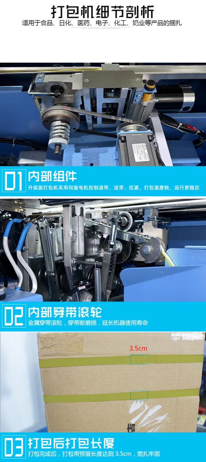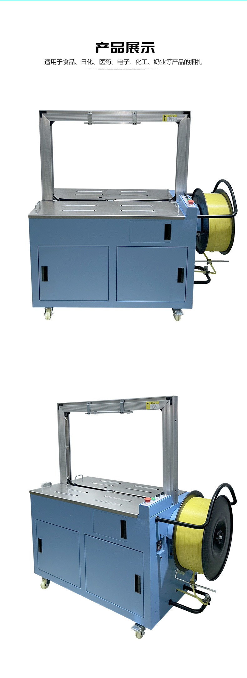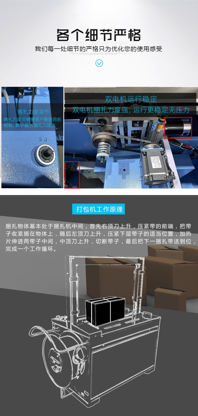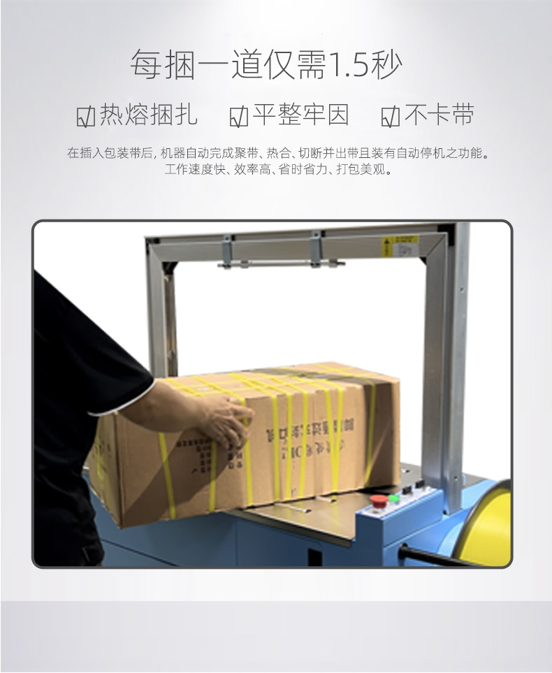 結(jié)構(gòu)組成 伺服電機(jī):作為核心部件,相比傳統(tǒng)電機(jī),它能實現(xiàn)更高的控制精度和響應(yīng)速度,可在捆扎時精準(zhǔn)調(diào)整捆扎帶張力,保障捆扎的緊密與均勻。 控制系統(tǒng):負(fù)責(zé)智能化管理整個捆扎流程。通過傳感器與程序控制,實時監(jiān)測并調(diào)整捆扎速度、張力等參數(shù),用戶還能依不同產(chǎn)品需求設(shè)定相應(yīng)捆扎參數(shù),滿足多樣化包裝需求。 捆扎裝置:一般采用熱合或熱熔方式固定捆扎帶。熱合是通過加熱使捆扎帶兩端熔合,形成牢固的捆扎效果,提高捆扎強(qiáng)度,防止運輸過程中松脫。 輸送系統(tǒng):負(fù)責(zé)將待捆扎產(chǎn)品送入捆扎機(jī),常與輸送帶或自動化生產(chǎn)線等其他生產(chǎn)設(shè)備聯(lián)動,形