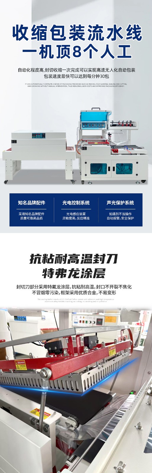 • 全程自動化操作,無需人工封切 / 套膜,單機包裝速度可達30-120 件 / 分鐘(根據產品尺寸調整,小產品速度更快),遠超手動包裝(約 5-10 件 / 分鐘),適合批量生產場景。