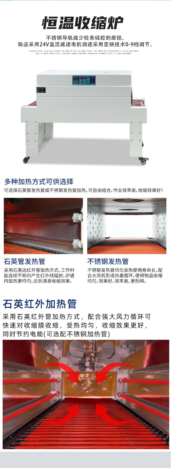 • 收縮爐采用 “不銹鋼保溫爐體 + 熱風循環設計”,熱量流失少,比傳統開放式加熱節能 20%-30%;