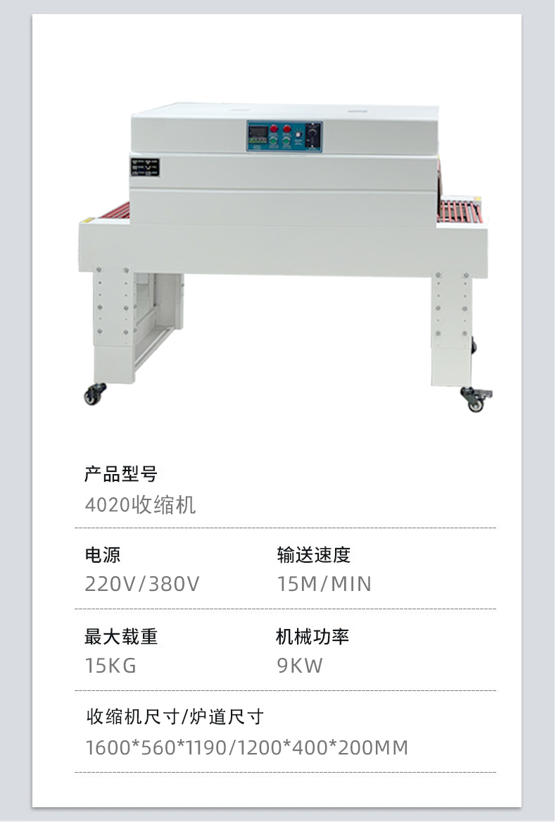 3. 熱收縮單元不銹鋼爐體、加熱管(翅片式 / 紅外)、熱風循環風機、特氟龍輸送帶實現膜的熱收縮定型,熱風循環確保膜受熱均勻,特氟龍輸送帶耐高溫不粘膜
