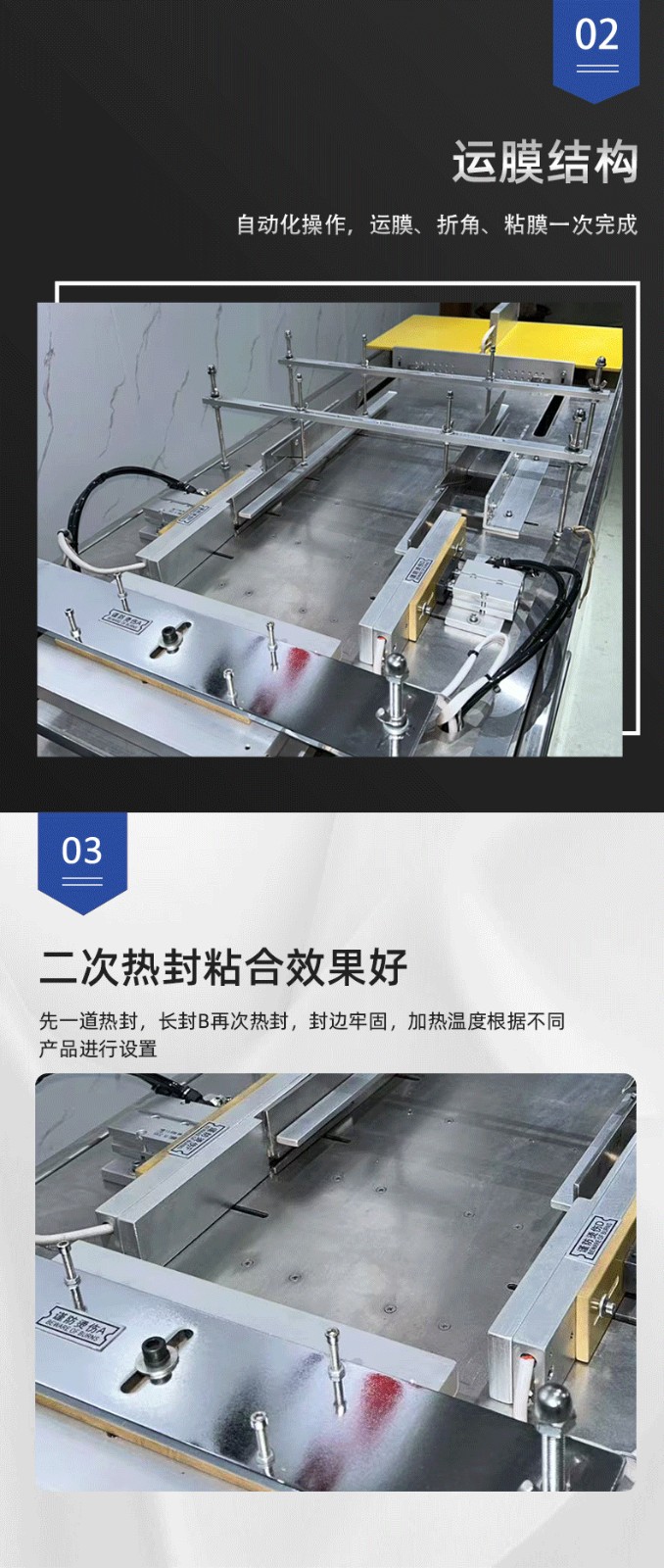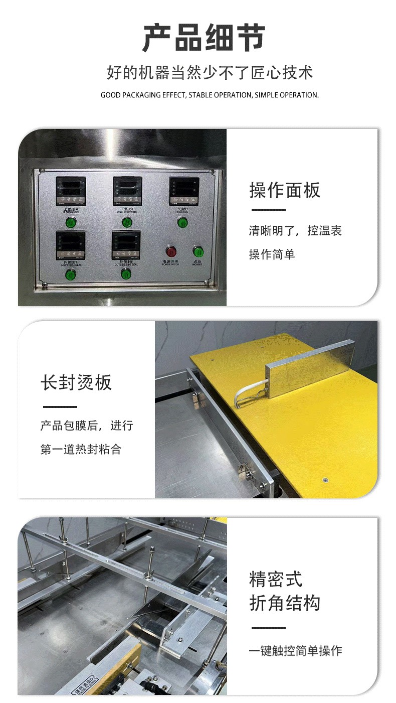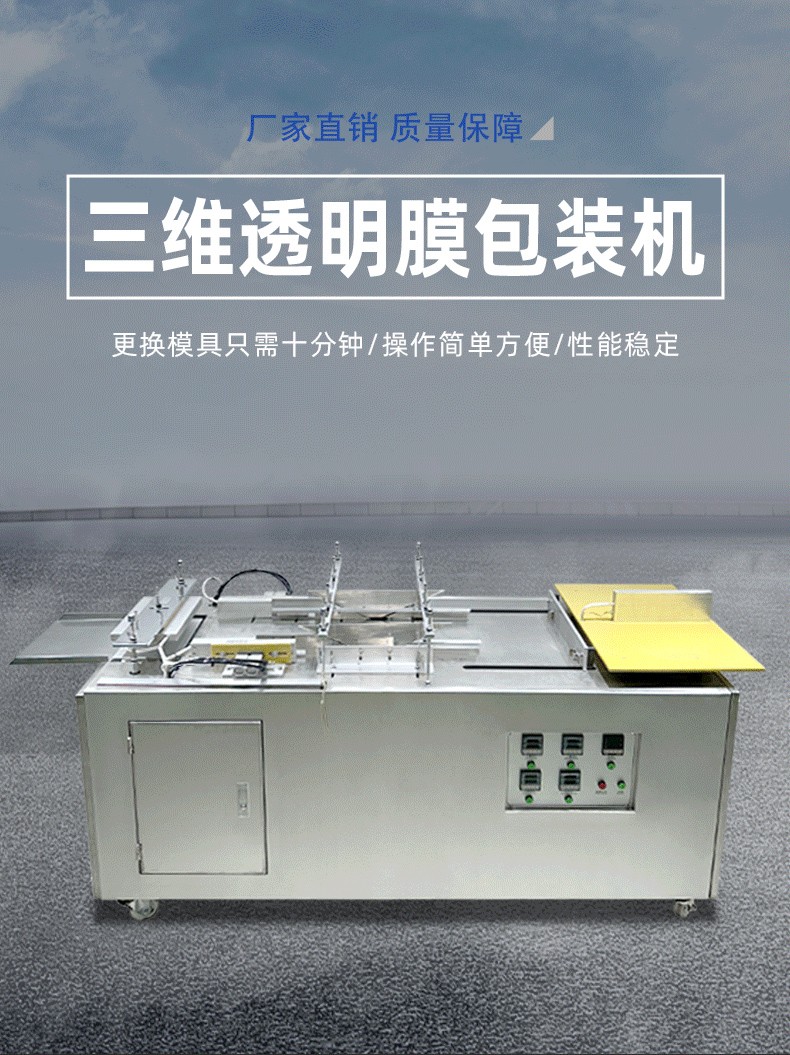 設備通過 “膜料預處理→人工上料定位→三維裹膜成型→熱封切邊→折邊定型→成品輸出” 的流程,實現產品的立體包裝,具體步驟拆解如下: