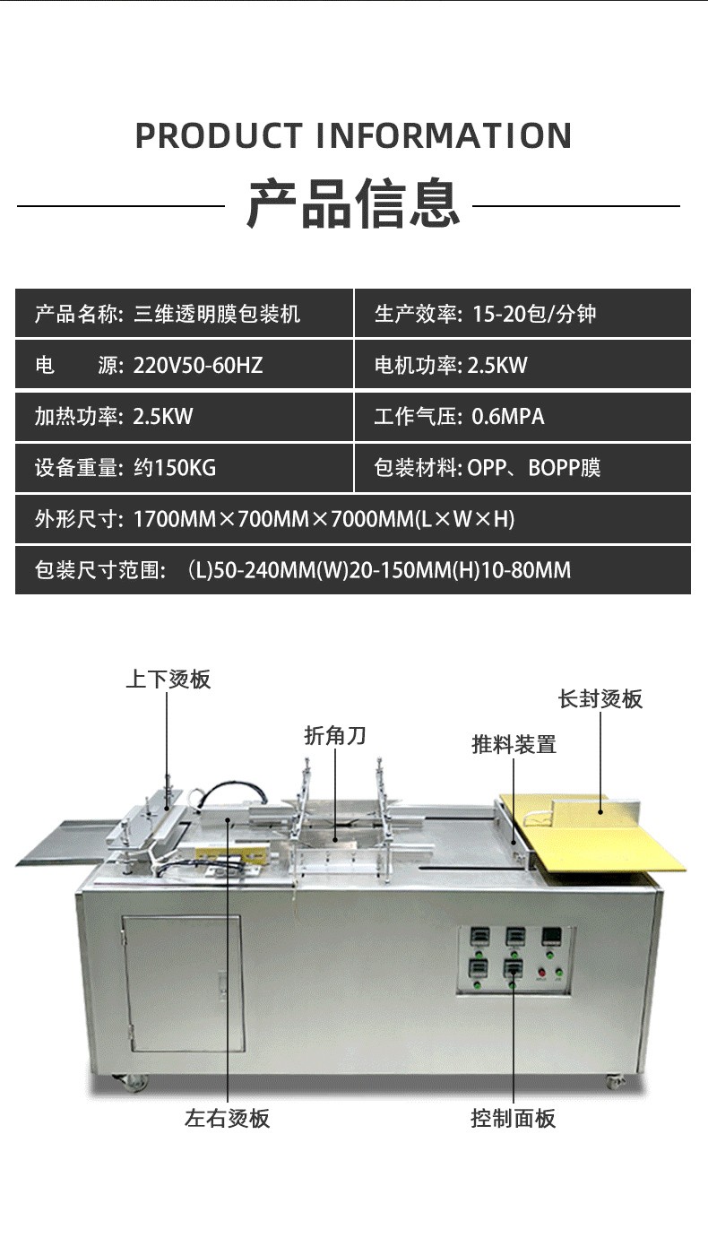半自動三維透明膜包裝機(又稱半自動透明膜裹包機、半自動煙包機)是醫藥、食品、日化等行業常用的包裝設備,核心功能是通過BOPP 透明膜(或含鋁箔的復合膜) 對產品進行三維立體裹包,形成類似香煙盒外層的緊致、透明(或半透明)包裝,兼具防塵、防潮、防偽及提升產品外觀檔次的作用。其 “半自動” 特性主要體現在需人工輔助上料,后續裹膜、封切、折邊等核心工序自動完成。 一、核心工作原理 設備通過 “膜料供送→人工上料定位→膜料裹覆→熱封切邊→折邊定型→成品輸出” 的流程,實現產品的三維膜包裝,具體步驟如下: 膜料準備