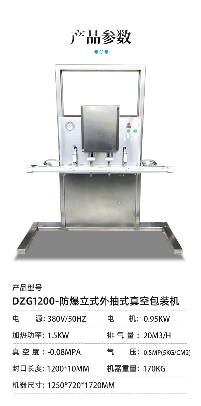防爆立式外抽真空包裝機(jī)是在普通立式外抽真空包裝機(jī)的基礎(chǔ)上,采用了防爆技術(shù),使其能夠在存在易燃易爆氣體、粉塵等危險環(huán)境中安全運(yùn)行的包裝設(shè)備,主要用于化工、醫(yī)藥、制藥、民爆、實(shí)驗(yàn)室、航天航空等領(lǐng)域中易燃易爆物品的包裝封口、儲存。 工作原理 將包裝物裝進(jìn)復(fù)合塑料真空袋內(nèi),把真空包裝袋的袋口套在機(jī)器的抽氣嘴上。 啟動機(jī)器后,由上壓塊下壓,壓著袋口封閉,接著真空泵自動啟動抽氣,將包裝袋內(nèi)的空氣抽出,抽至預(yù)設(shè)的真空度。 最后加壓、加熱使包裝袋口封合,完成真空包裝過程。 特點(diǎn) 防爆性能優(yōu)越:采用物理隔離防爆技術(shù),嚴(yán)格選