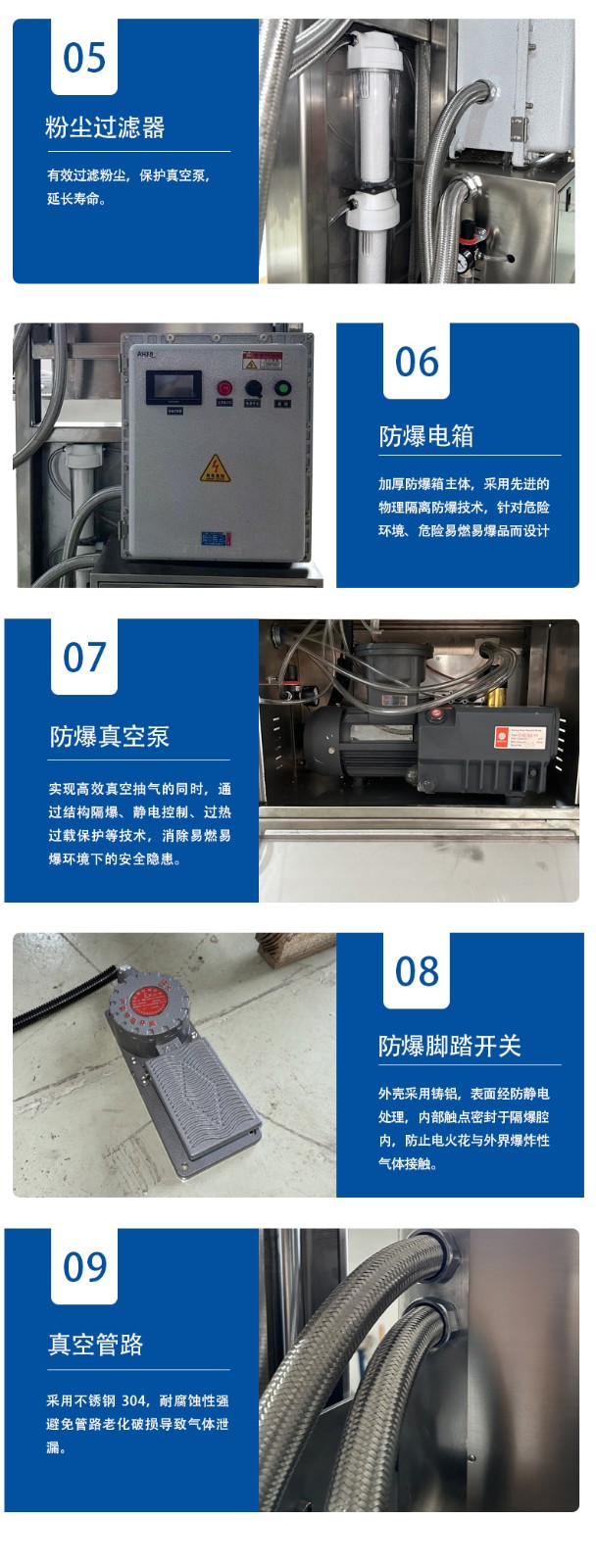 • 防爆性能優(yōu)越:采用物理隔離防爆技術(shù),嚴(yán)格選用防爆達(dá)標(biāo)元件,電器箱、真空泵、熱封條等都經(jīng)過特殊的防爆處理,能有效防止在操作過程中產(chǎn)生火花,避免爆炸等危險情況的發(fā)生2