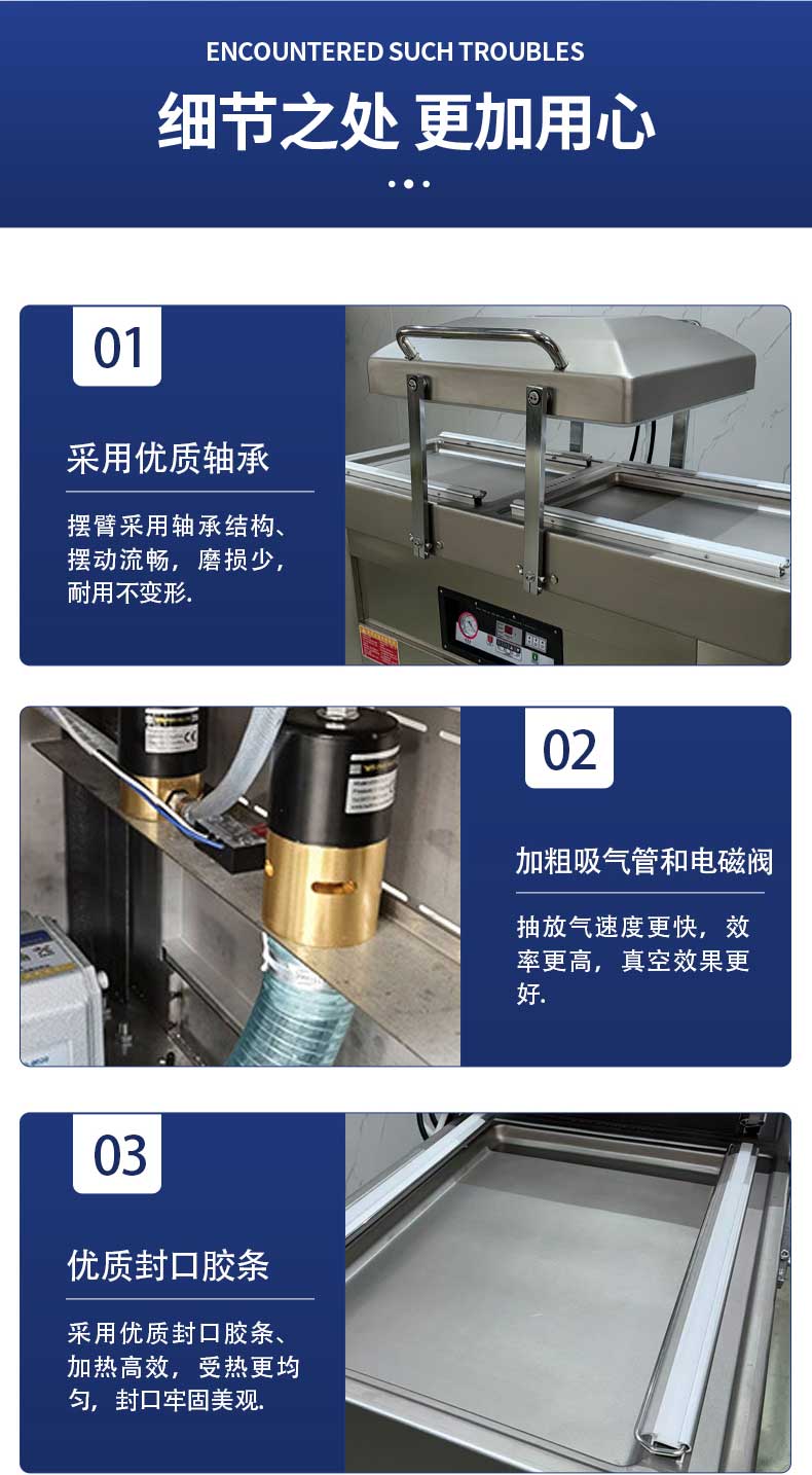 • 雙室設計:一個真空室在抽真空時,另一個真空室可以擺放包裝物,交替工作,節省操作時間,提高包裝效率。