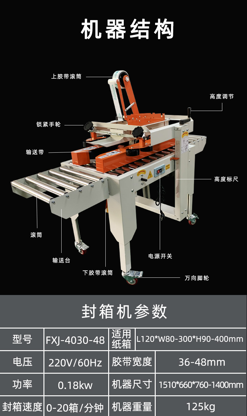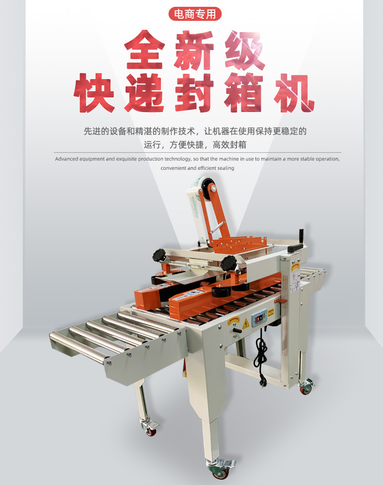 封箱機是一種用于紙箱封箱包裝的設備,主要適用于紙箱的封箱包裝,既可單機作業(yè),也可與流水線配套使用。它可單箱作業(yè),也可與紙箱成型開箱機、裝箱機、貼標機、捆包機、棧板堆疊機、輸送機等設備配套成包裝流水線使用,為包裝流水線作業(yè)必須的設備。封箱機的主要分類包括自動拆蓋封箱機系列、氣動調(diào)整封箱機系列、自動封箱機系列、邊角式封箱機系列、四角邊封箱機、工字型封箱等,封箱方式可分為上下驅(qū)動、左右驅(qū)動、側(cè)邊、角邊等,一般采用透明膠帶以及牛皮紙材料。