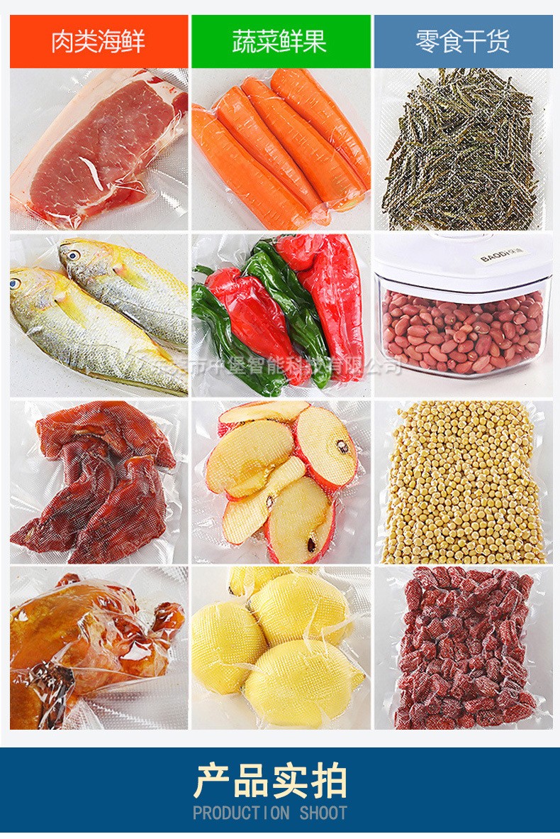 真空包裝機能夠自動抽出包裝袋內的空氣,達到預定真空度后完成封口工序。亦可再充入氮氣或其它混合氣體,然后完成封口工序。真空包裝機常被用于食品行業,因為經過真空包裝以后,食品能夠抗氧化,從而達到長期保存的目的。