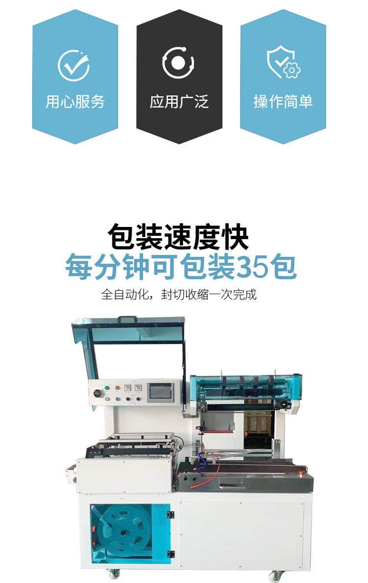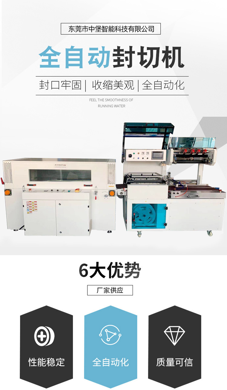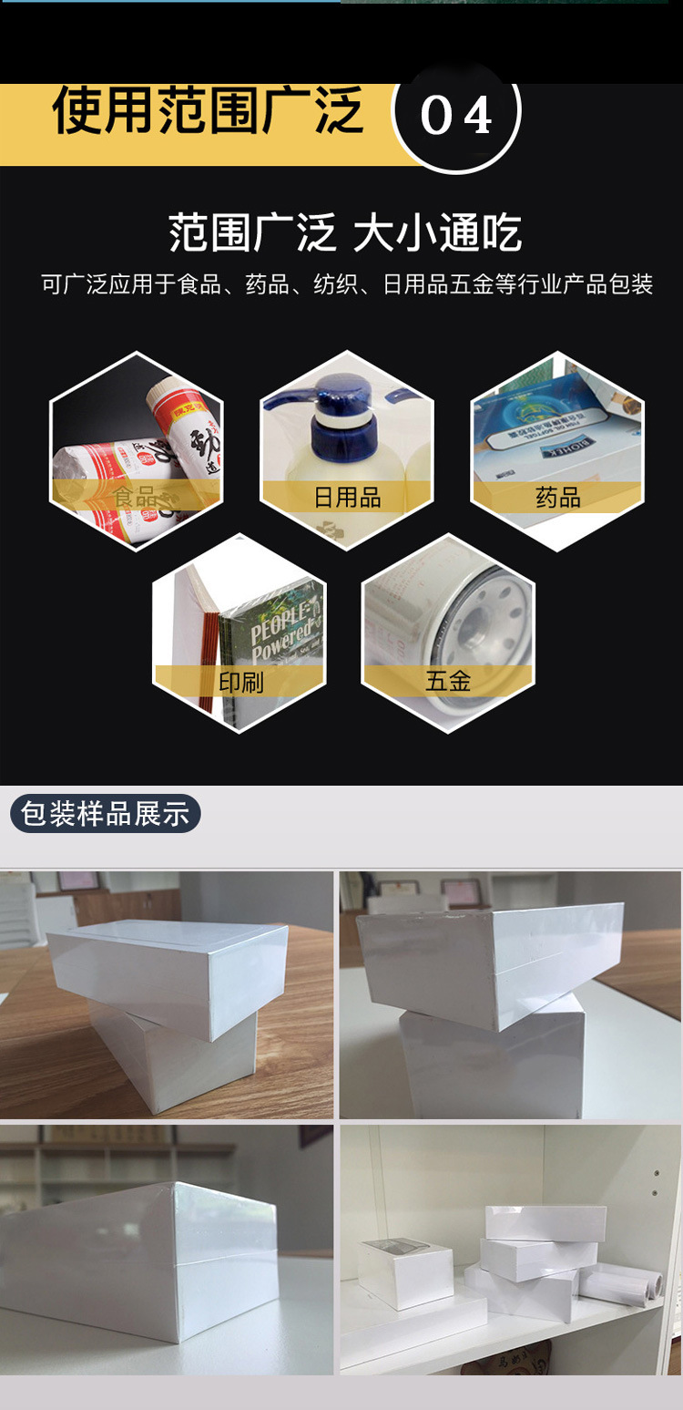 全自動封切機適用于需要四面密封的食品,飲料,罐頭,酒,日化,日用品等產品的集體包裝,包裝后的產品具有美觀,防潮,防塵,防破損等優勢。